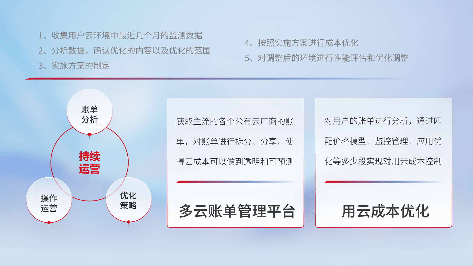 通过多云纳管,,,以统一的资源数据模型把客户的云资源进行抽象和封装,,,,进而实现对多云资源的统一操作,,,,保障云资源管理的可靠性、、、稳定性与可用性。。量身定制化运维内容,,,配置、、开发运维、、补丁管理、、备份、、监控、、、认证和访问管理、、审计和日常巡检等,,保障在用云过程中的可靠度,,稳定度以及高可用率。。。。