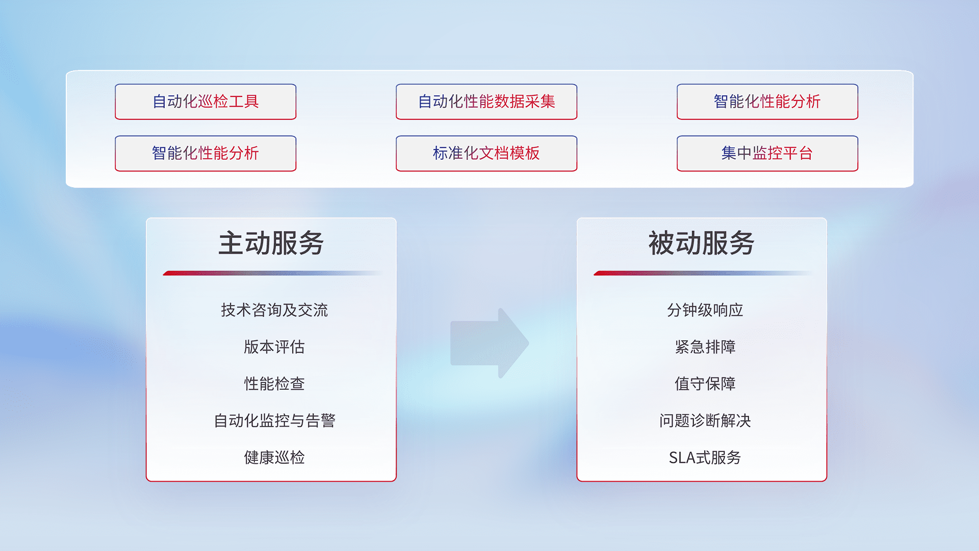 智能化工具和标准化文档,,,保障服务质量,,提供主动服务(包含技术咨询、、、、版本评估、、、、性能检查、、、自动化监控与告警、、、健康巡检)和被动服务包含(分钟级响应、、、紧急排障、、、、值守保障、、、、问题诊断解决、、、SLA服务)。。